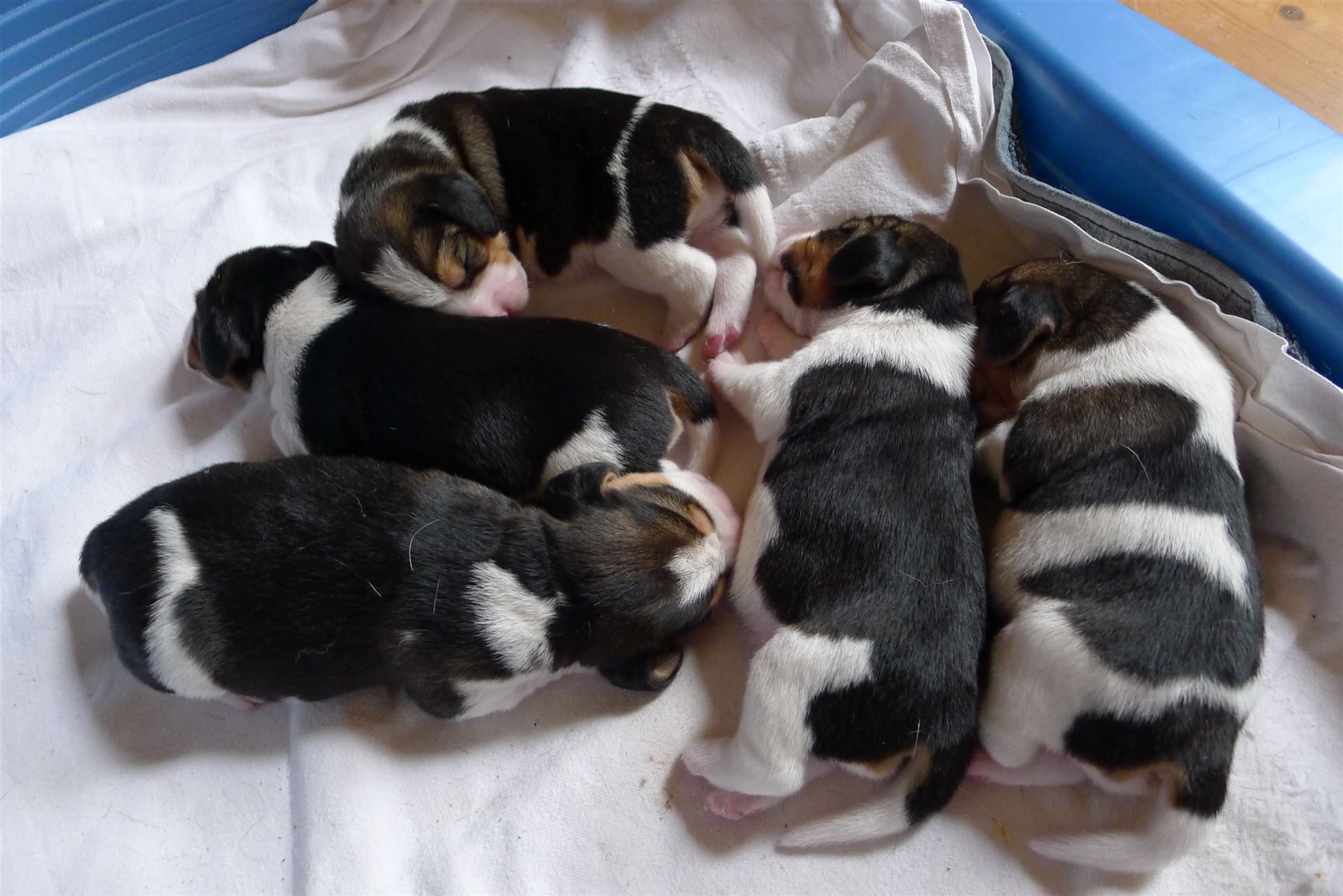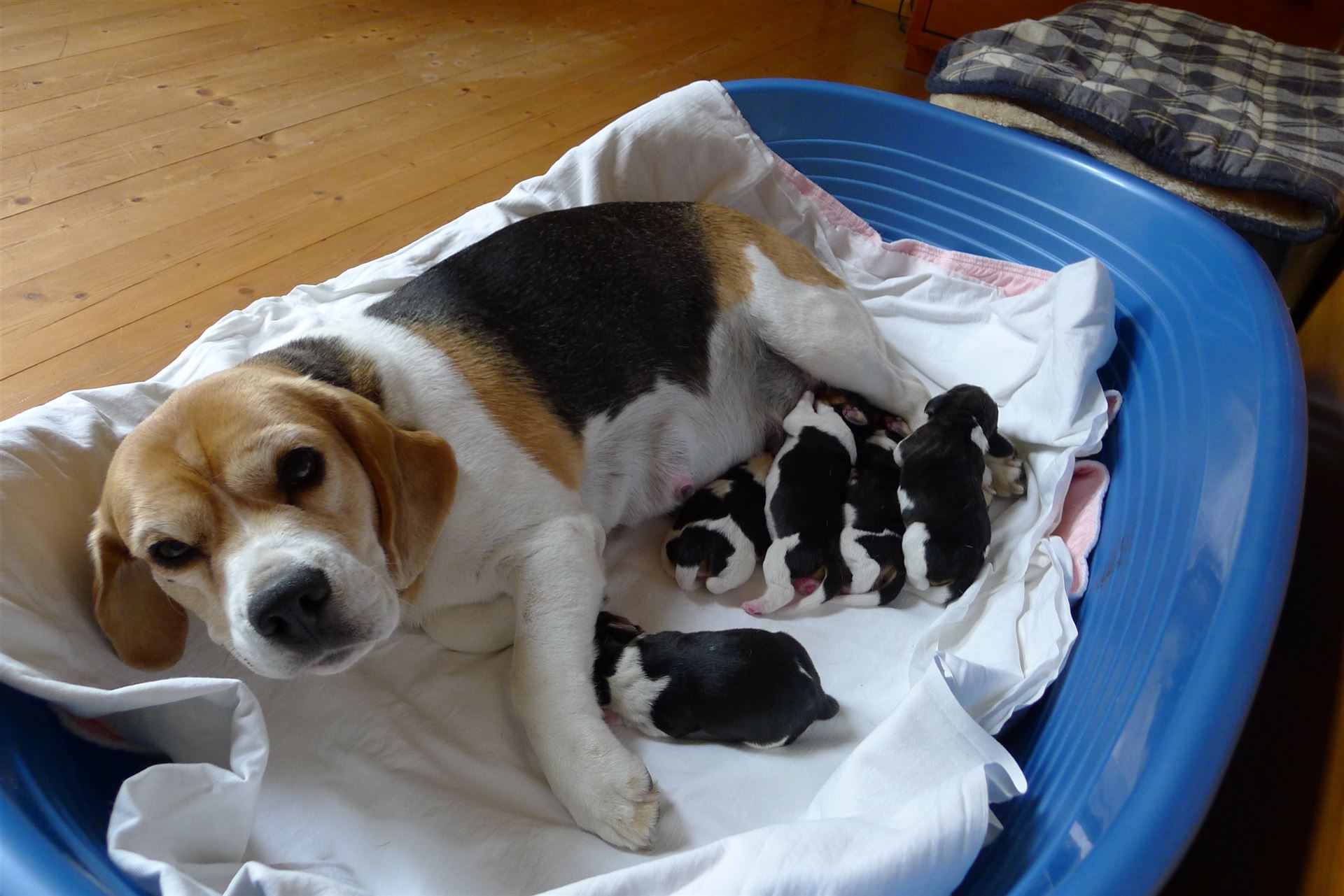 Die ersten zwei Wochen waren Hündin und Welpen in der Wohnung untergebracht. Hier habe ich sie immer unter Kontrolle.