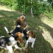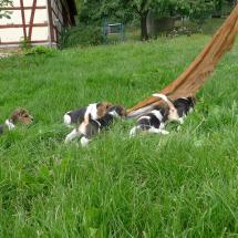 Nachdem sich Augen und Ohren geöffnet hatten zog der Wurf in den Welpenzwinger um. Dort konnten die Welpen auch in den Außenbereich und die Umwelt mit Geräuschen und Gerüchen erkunden.